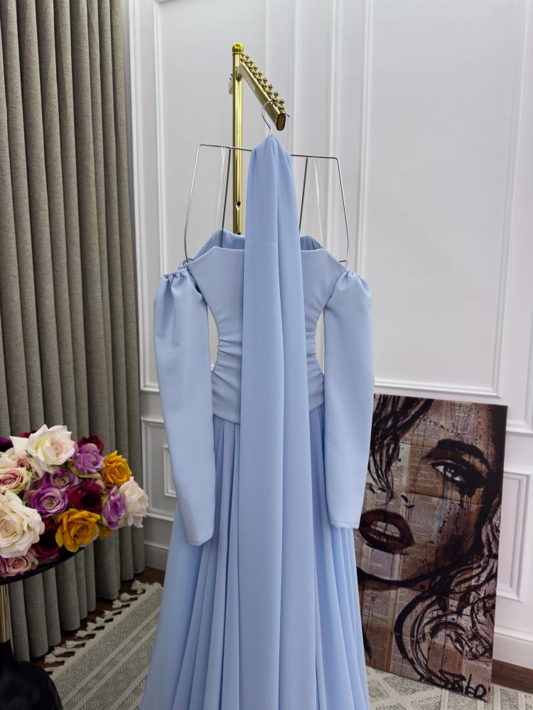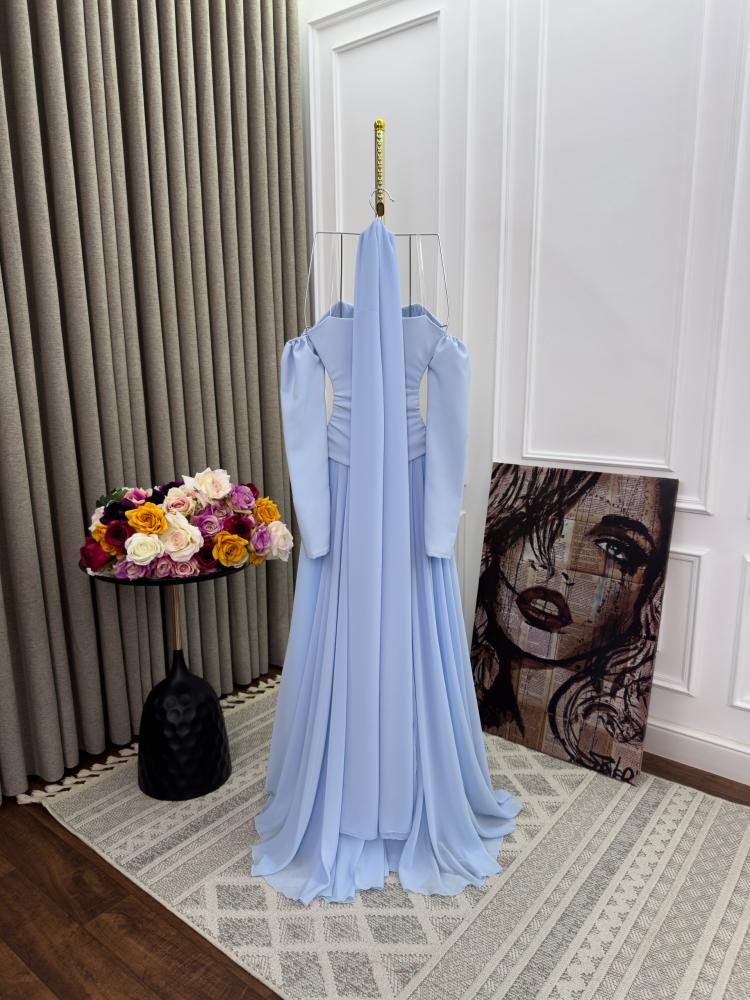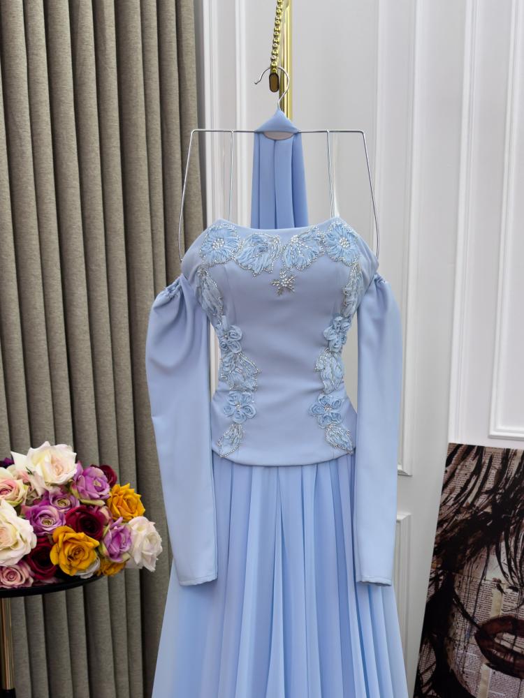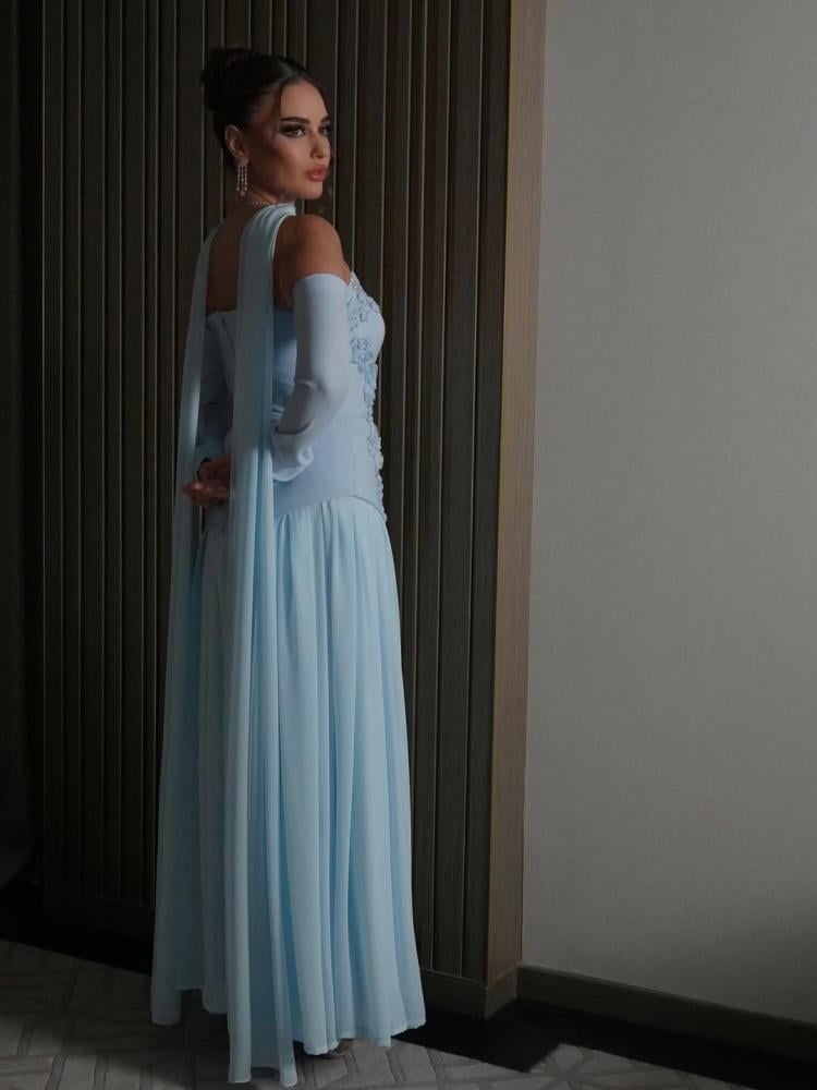 فساتين سهرة سماوي شيفون مطرز بتصميم راقٍ وتطريز ناعم يعكس الأنوثة والأناقة مثالي للمناسبات الخاصة بفضل لونه البيبي بلو الهادئ وتفاصيله الفاخرة.