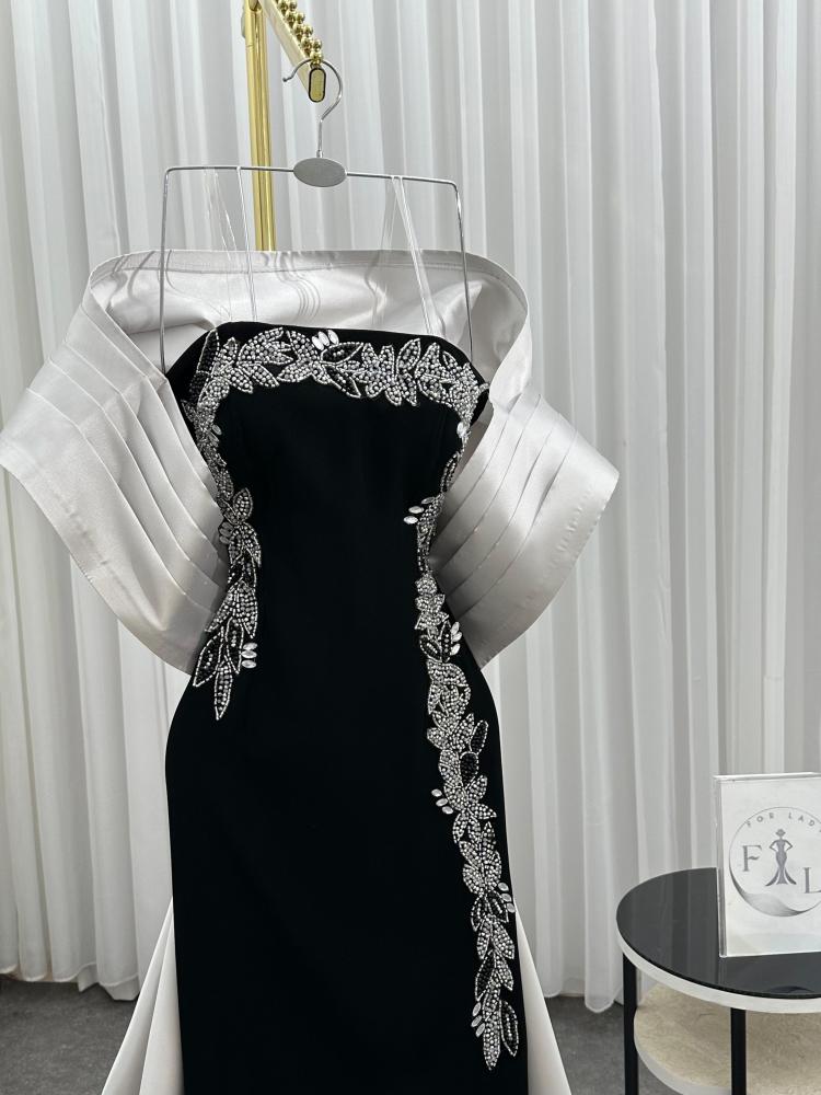 فستان بذيل ميكادو أنيق بلون أسود وفضي يضفي لمسة فاخرة وجذابة مع خامات عالية الجودة وتصميم راقٍ يناسب السهرات والمناسبات الخاصة.